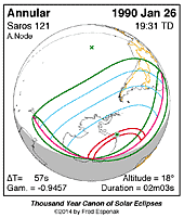 | 1990 Jan 26 | 19:31:24 | Annular | 121 | 0.967 | 02m03s | s South America, Antarctica