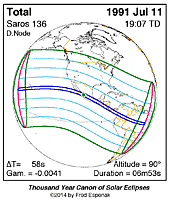 | 1991 Jul 11 | 19:07:01 | Total | 136 | 1.080 | 06m53s | e Pacific, N. & South America