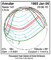 | 1992 Jan 04 | 23:05:37 | Annular | 141 | 0.918 | 11m41s | n Australia, Pacific, w North America