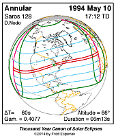 | 1994 May 10 | 17:12:27 | Annular | 128 | 0.943 | 06m13s | e Pacific, North America, Europe, w Africa
