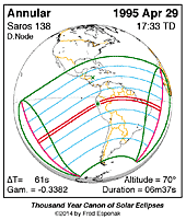 | 1995 Apr 29 | 17:33:21 | Annular | 138 | 0.950 | 06m37s | s Pacific, C. & South America, Atlantic