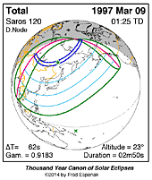 | 1997 Mar 09 | 01:24:51 | Total | 120 | 1.042 | 02m50s | Asia, Alaska