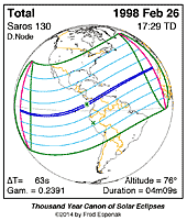 | 1998 Feb 26 | 17:29:27 | Total | 130 | 1.044 | 04m09s | N., C. & South America