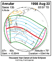 | 1998 Aug 22 | 02:07:11 | Annular | 135 | 0.973 | 03m14s | Asia, Australia, New Zealand