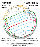 | 1999 Feb 16 | 06:34:38 | Annular | 140 | 0.993 | 00m40s | s Africa, Antarctica, Australia, New Zealand