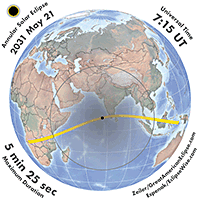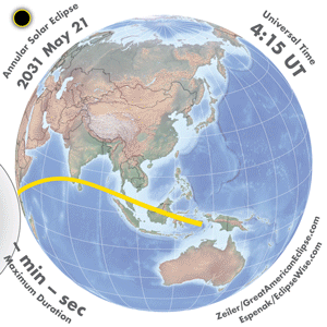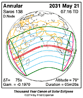 | 2031 May 21 | 07:16:04 | Annular | 138 | 0.959 | 05m26s | Africa, s Asia, East Indies, Australia