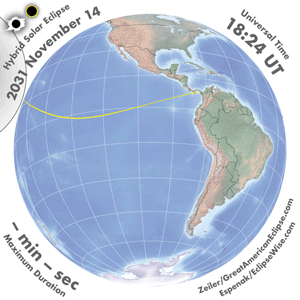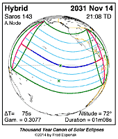 | 2031 Nov 14 | 21:07:31 | Hybrid | 143 | 1.011 | 01m08s | Pacific, s US, Central America, nw South America