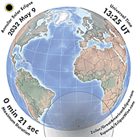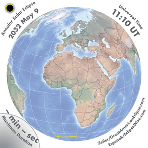| 2032 May 09 | 13:26:42 | Annular | 148 | 0.996 | 00m22s | s South America, s Africa