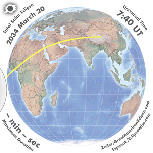 | 2034 Mar 20 | 10:18:45 | Total | 130 | 1.046 | 04m09s | Africa, Europe, w Asia