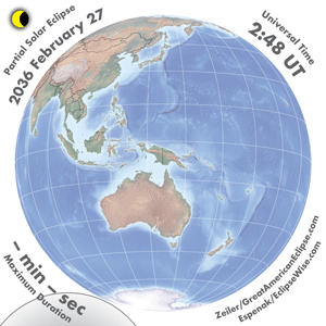 | 2036 Feb 27 | 04:46:49 | Partial | 150 | 0.629 | - | Antarctica, s Australia, New Zealand |