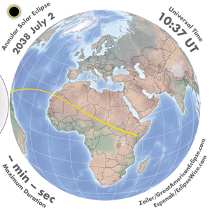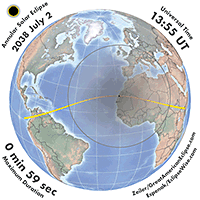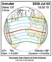 | 2038 Jul 02 | 13:32:55 | Annular | 137 | 0.991 | 01m00s | N. & C. America, South America, Africa, Europe, Mid East