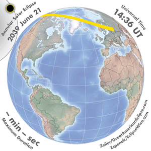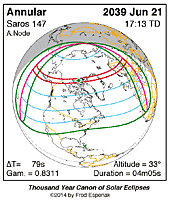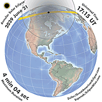 | 2039 Jun 21 | 17:12:54 | Annular | 147 | 0.945 | 04m05s | North America, w Europe