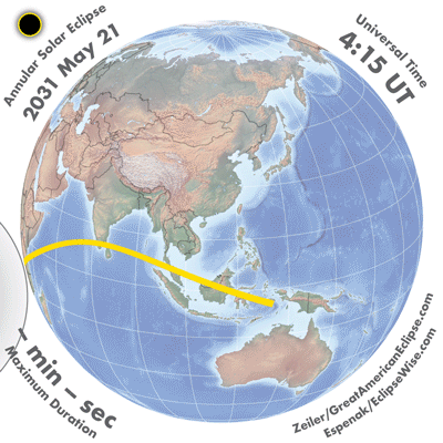 A concise summary of all solar eclipses from 2031 through 2040 is presented here in four ways. The first is a World Map showing the path of every central solar eclipse (total, annular, and hybrid). The second is a series of Global Maps showing the geographic regions of visibility for each eclipse. The third is a series of Global Map Animations showing the Moon's shadows sweeping across Earth for each eclipse. The forth is a Table listing the primary characteristics of each solar eclipse. Near the bottom of the page are a series of Links for more on solar eclipses.