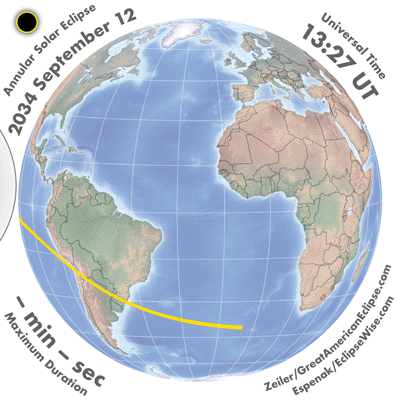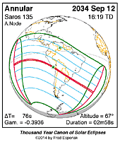 | 2034 Sep 12 | 16:19:28 | Annular | 135 | 0.974 | 02m58s | C. America, South America