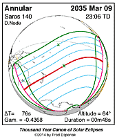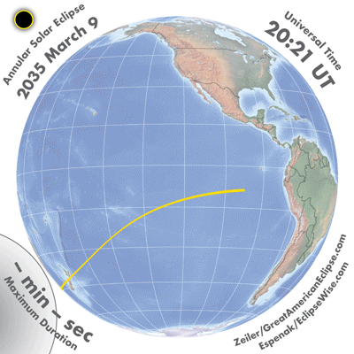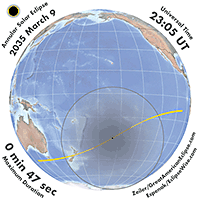 | 2035 Mar 09 | 23:05:54 | Annular | 140 | 0.992 | 00m48s | Australia, New Zealand, s Pacific, Mexico, Antarctica