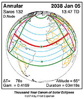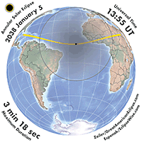| 2038 Jan 05 | 13:47:11 | Annular | 132 | 0.973 | 03m18s | e North America, n South America, Atlantic, Africa, Europe