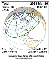 | 2033 Mar 30 | 18:02:36 | Total | 120 | 1.046 | 02m37s | North America