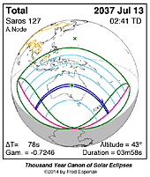 | 2037 Jul 13 | 02:40:36 | Total | 127 | 1.041 | 03m58s | East Indies, Australia, Pacific