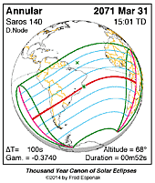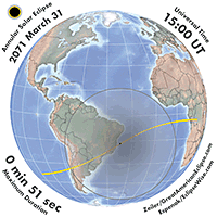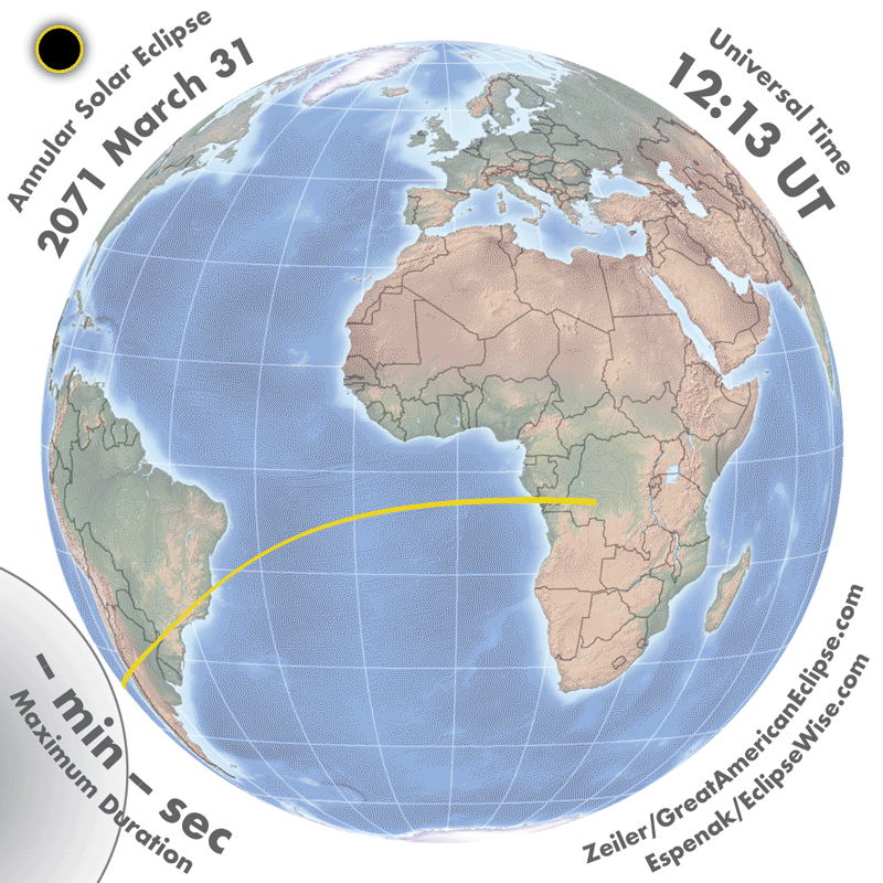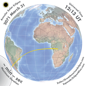 | 2071 Mar 31 | 15:01:06 | Annular | 140 | 0.992 | 00m52s | South America, Africa, Antarctica