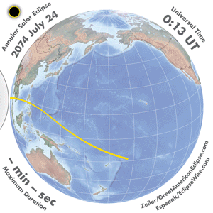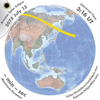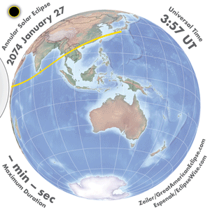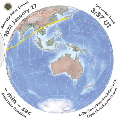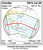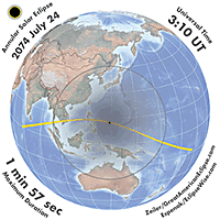 | 2074 Jul 24 | 03:10:32 | Annular | 137 | 0.984 | 01m57s | Asia, Indies, Australia, New Zealand