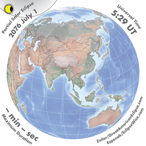 | 2076 Jul 01 | 06:50:43 | Partial | 157 | 0.275 | - | Russia, North America |