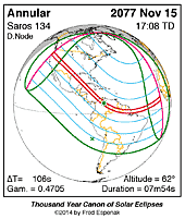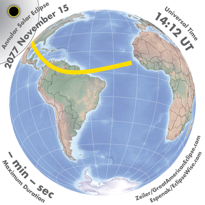 | 2077 Nov 15 | 17:07:56 | Annular | 134 | 0.937 | 07m54s | Americas