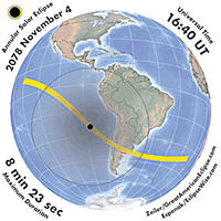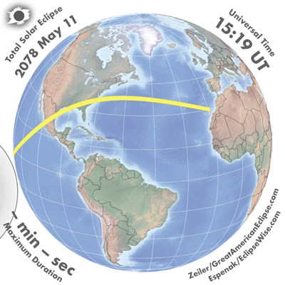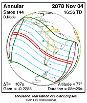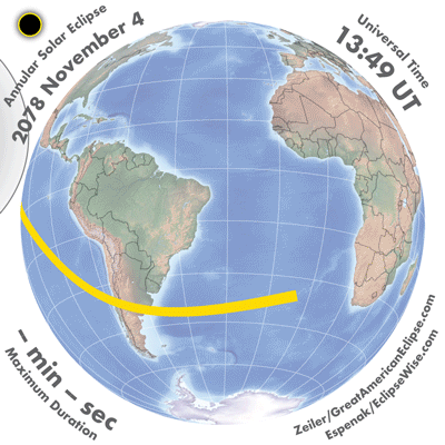 | 2078 Nov 04 | 16:55:44 | Annular | 144 | 0.926 | 08m29s | Americas, Antarctica
