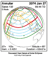 | 2074 Jan 27 | 06:44:15 | Annular | 132 | 0.980 | 02m21s | Africa, Asia, Indies