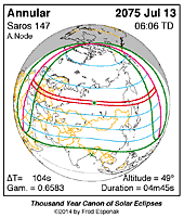 | 2075 Jul 13 | 06:05:44 | Annular | 147 | 0.947 | 04m45s | Europe, Asia, Africa, n North America