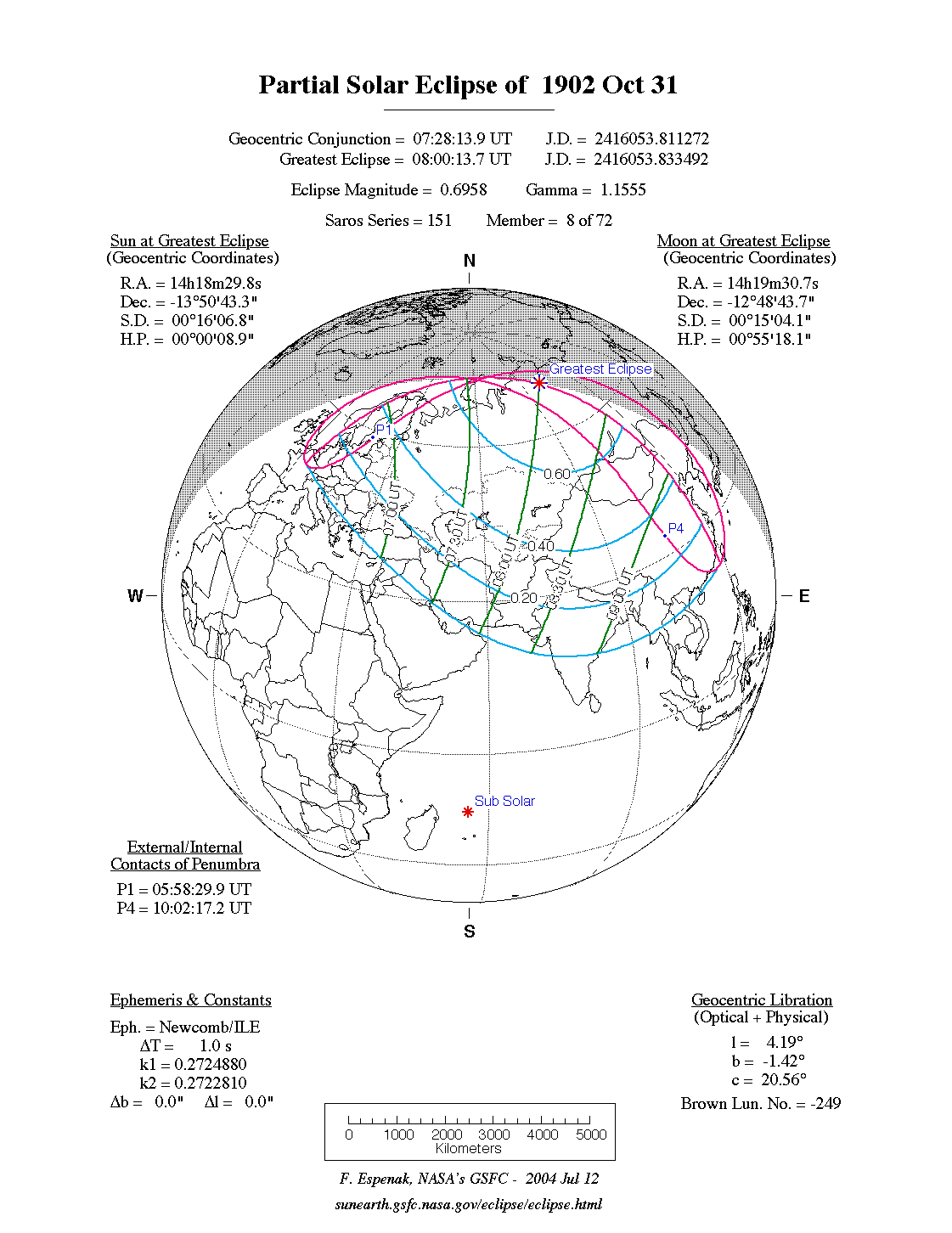 Predictions for the Partial Solar Eclipse of 1902 Oct 31were generated using the JPL DE406solar and lunar ephemerides. The lunar coordinates were calculated with respect to the Moon's Center of Mass. Although the predictions are first calculated in Terrestrial Dynamical Time (TD), they are then converted to Universal Time (UT1) as presented here.The parameter ΔT is used to convert between the two times (i.e., UT1 = TD - ΔT). For this eclipse ΔT has a value of 1.0 seconds.