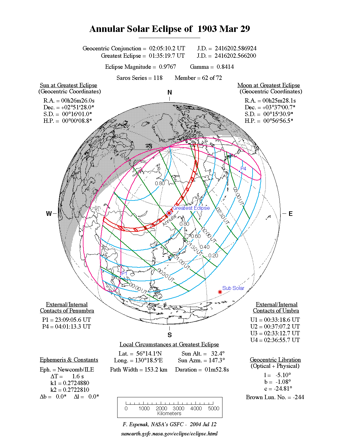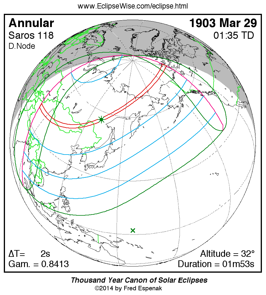 - Path Table: Annular Solar Eclipse of 1903 Mar 29 - coordinates of the central line and path limits