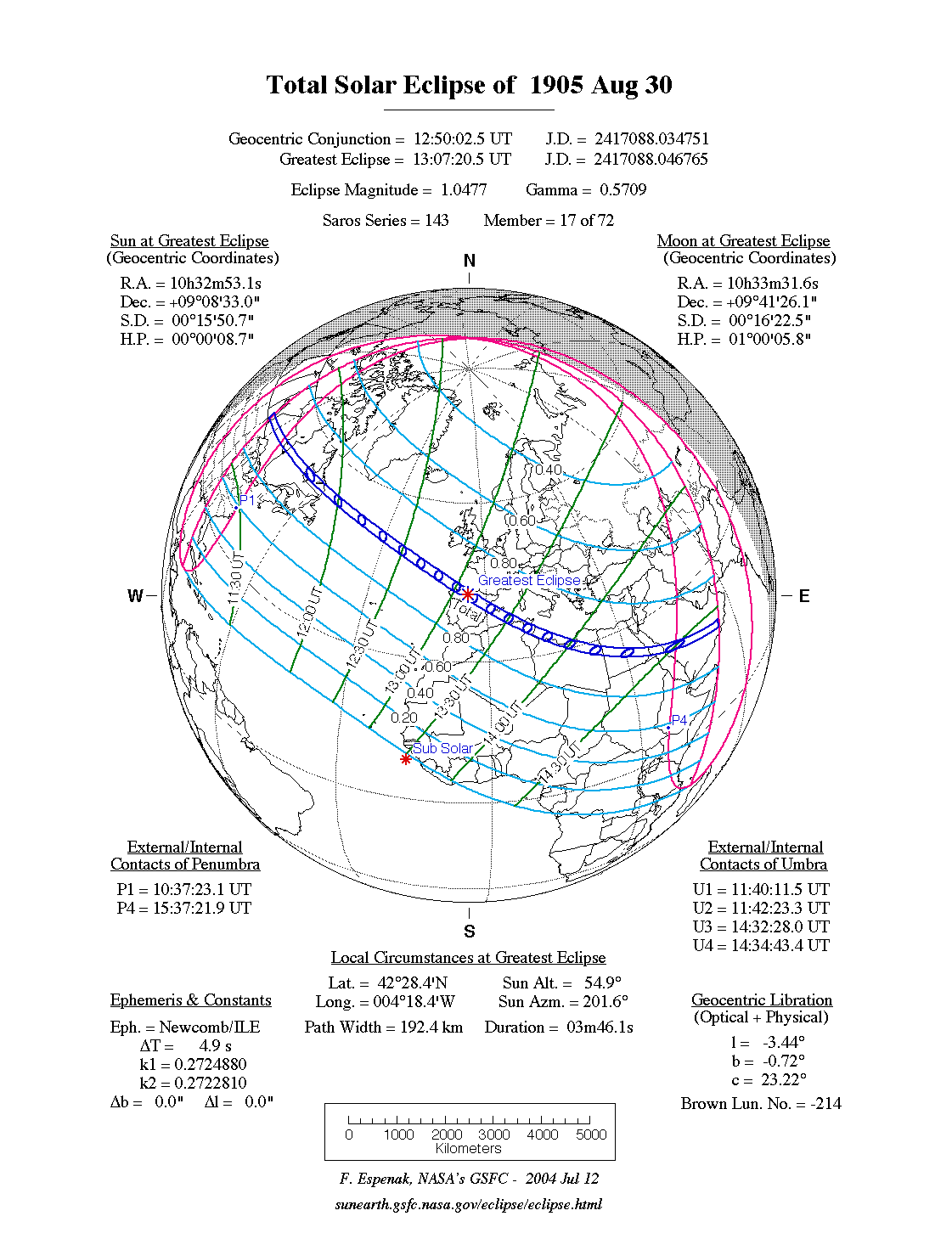 Predictions for the Total Solar Eclipse of 1905 Aug 30were generated using the JPL DE406solar and lunar ephemerides. The lunar coordinates were calculated with respect to the Moon's Center of Mass. Although the predictions are first calculated in Terrestrial Dynamical Time (TD), they are then converted to Universal Time (UT1) as presented here.The parameter ΔT is used to convert between the two times (i.e., UT1 = TD - ΔT). For this eclipse ΔT has a value of 4.6 seconds.