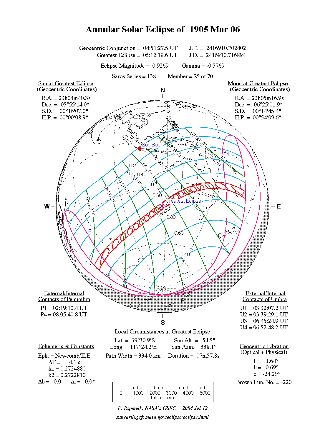 - Path Table: Annular Solar Eclipse of 1905 Mar 06 - coordinates of the central line and path limits