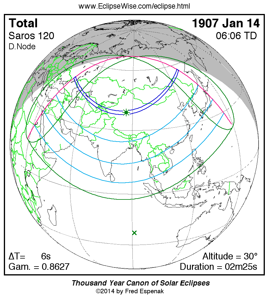 - Orthographic Map: Total Solar Eclipse of 1907 Jan 14 - detailed map of eclipse visibility