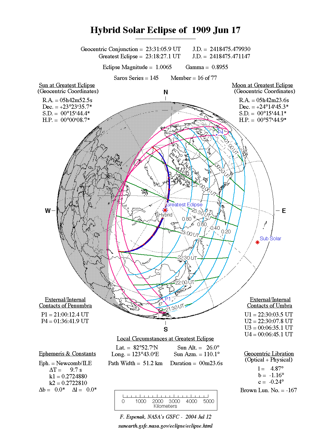 - Path Table: Hybrid Solar Eclipse of 1909 Jun 17 - coordinates of the central line and path limits