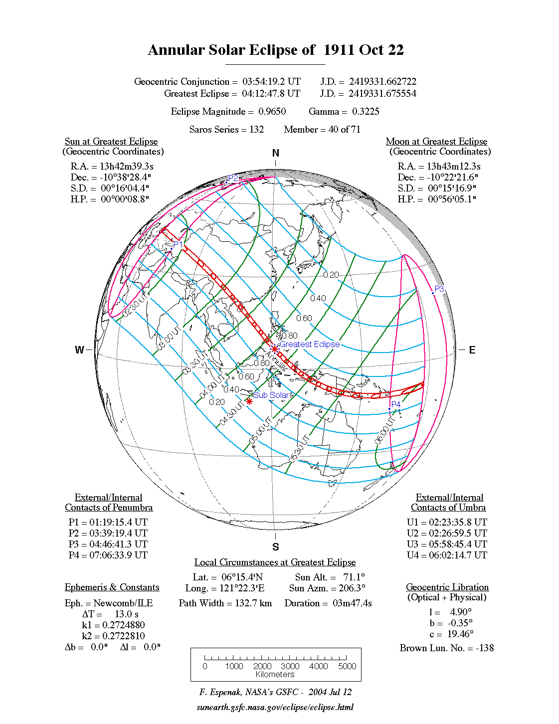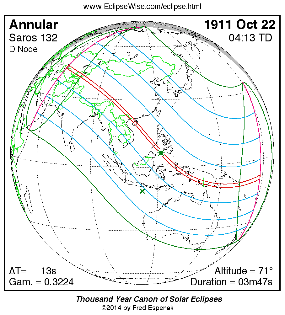 - Path Table: Annular Solar Eclipse of 1911 Oct 22 - coordinates of the central line and path limits