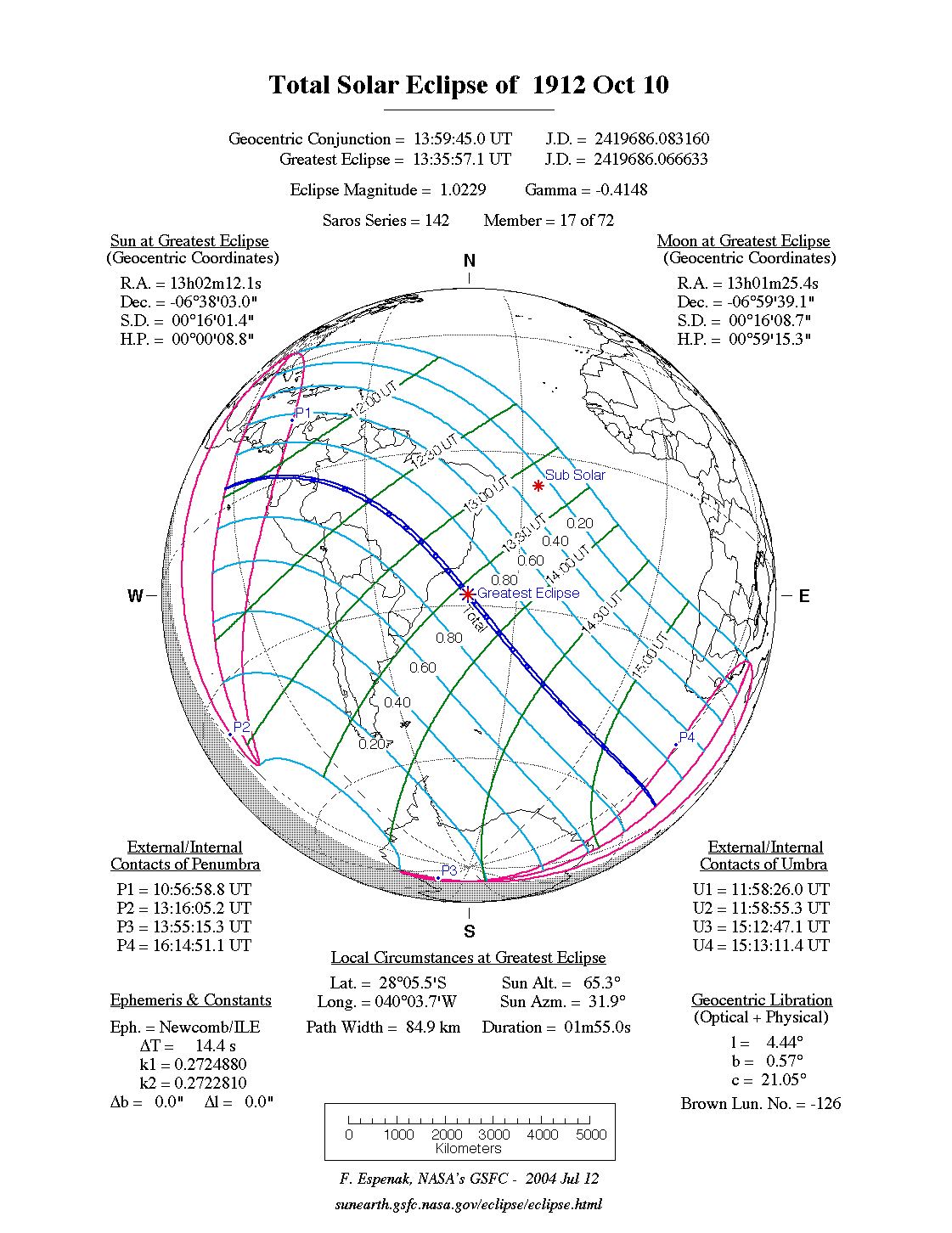 - Path Table: Total Solar Eclipse of 1912 Oct 10 - coordinates of the central line and path limits