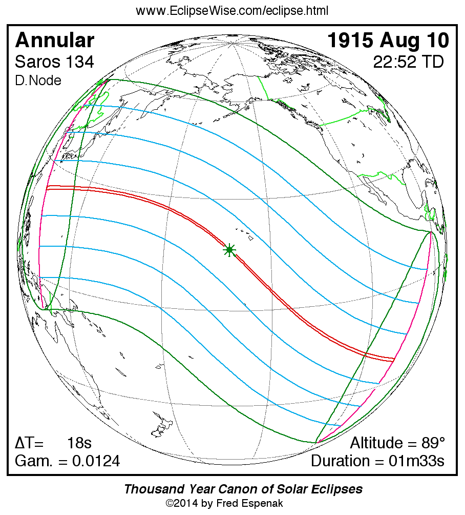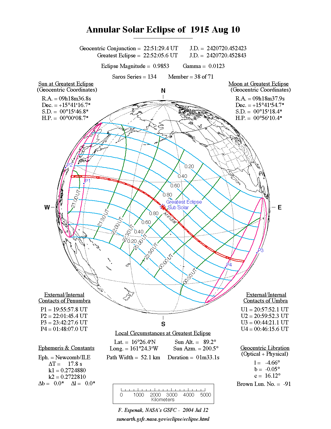 - Path Table: Annular Solar Eclipse of 1915 Aug 10 - coordinates of the central line and path limits