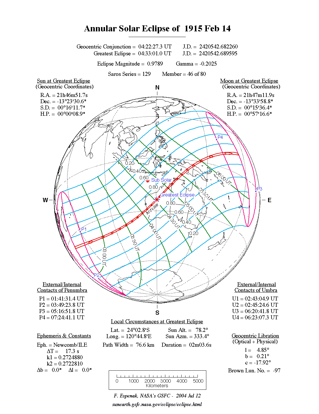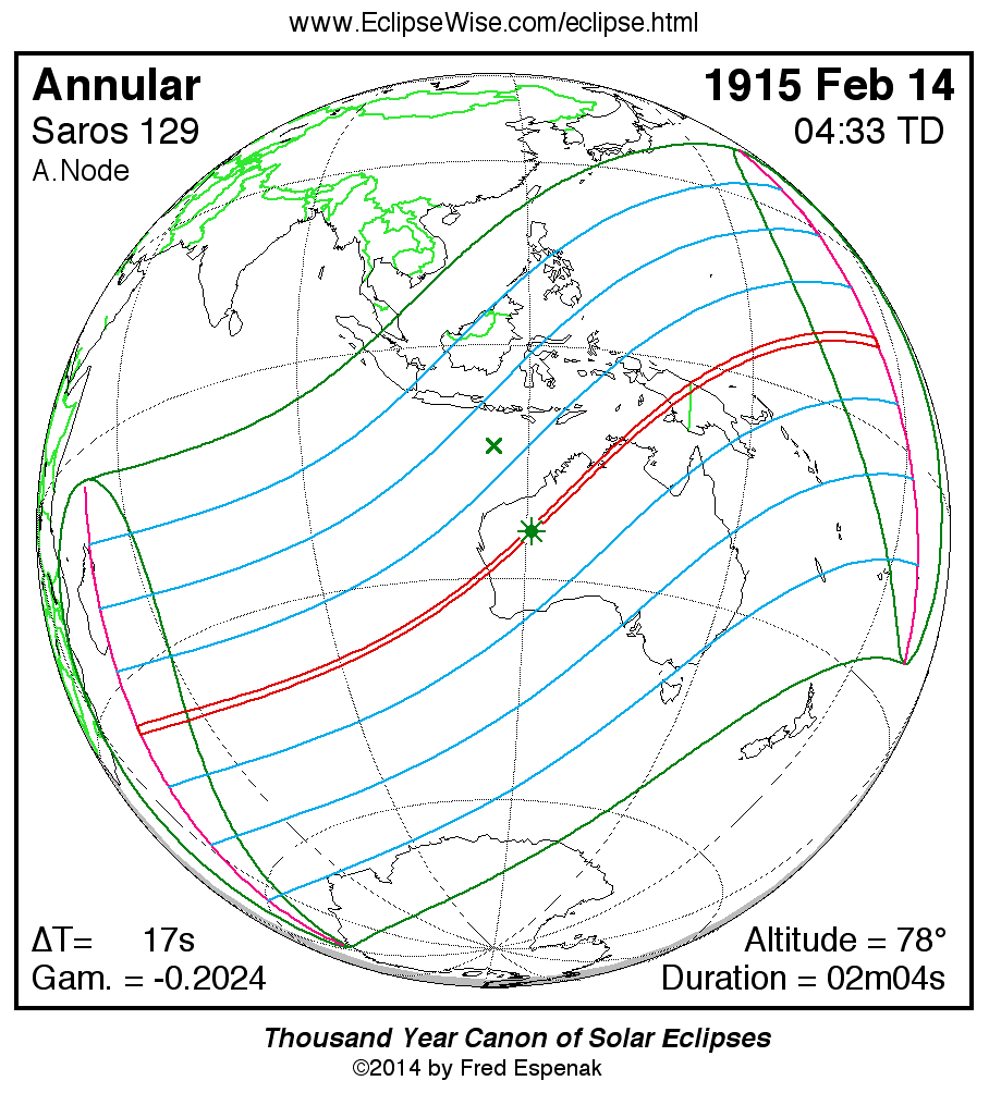 - Path Table: Annular Solar Eclipse of 1915 Feb 14 - coordinates of the central line and path limits