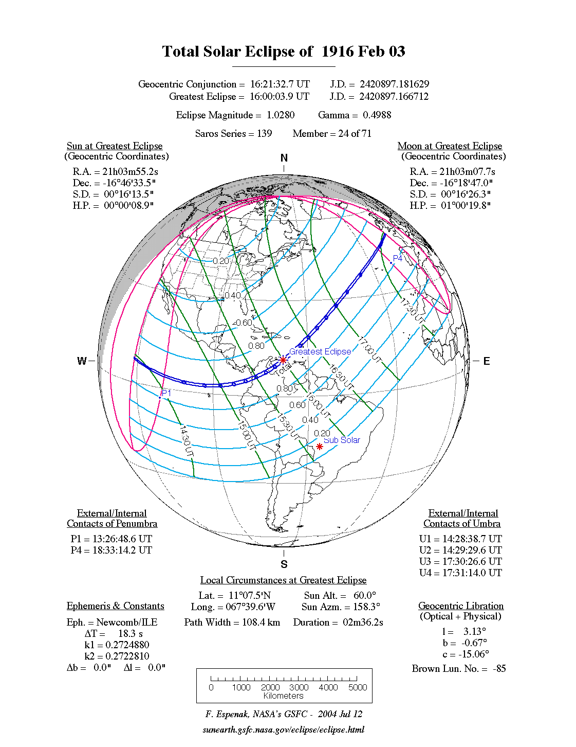 - Path Table: Total Solar Eclipse of 1916 Feb 03 - coordinates of the central line and path limits