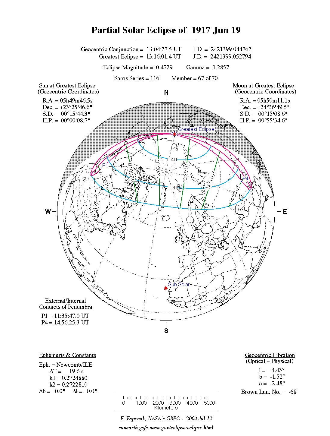 Predictions for the Partial Solar Eclipse of 1917 Jun 19were generated using the JPL DE406solar and lunar ephemerides. The lunar coordinates were calculated with respect to the Moon's Center of Mass. Although the predictions are first calculated in Terrestrial Dynamical Time (TD), they are then converted to Universal Time (UT1) as presented here.The parameter ΔT is used to convert between the two times (i.e., UT1 = TD - ΔT). For this eclipse ΔT has a value of 19.7 seconds.