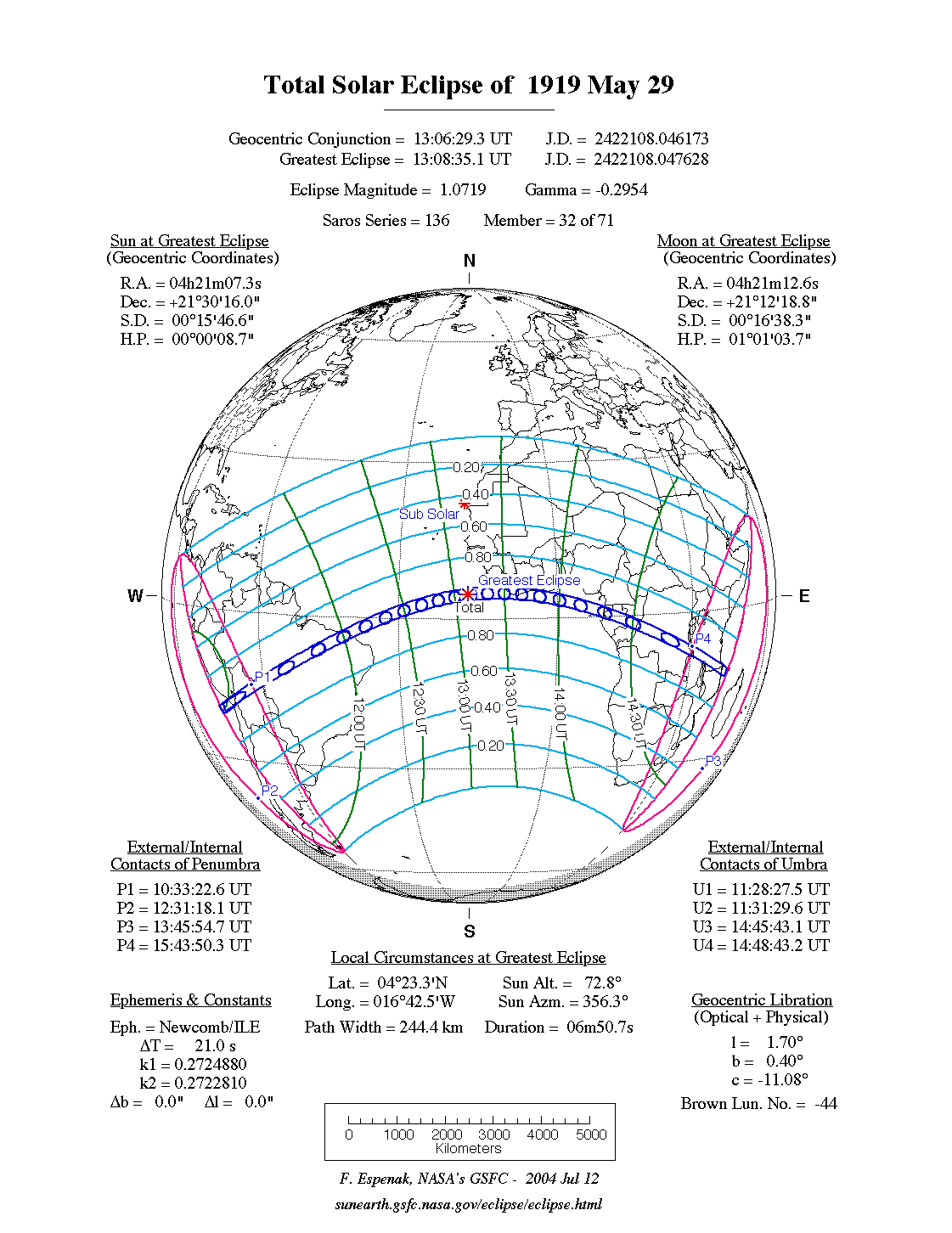 - Path Table: Total Solar Eclipse of 1919 May 29 - coordinates of the central line and path limits