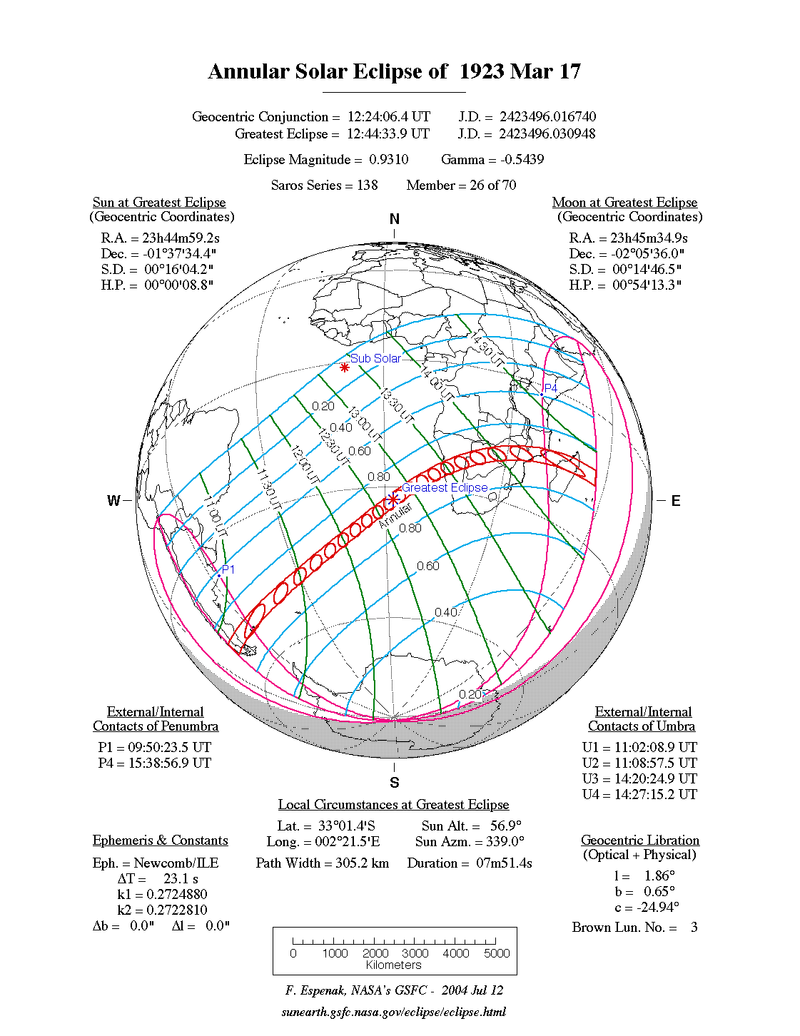 - Path Table: Annular Solar Eclipse of 1923 Mar 17 - coordinates of the central line and path limits