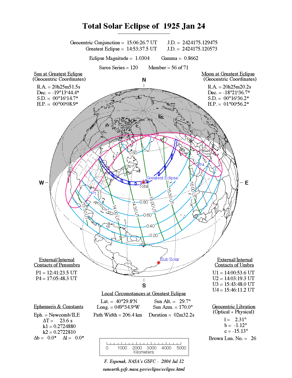 - Path Table: Total Solar Eclipse of 1925 Jan 24 - coordinates of the central line and path limits