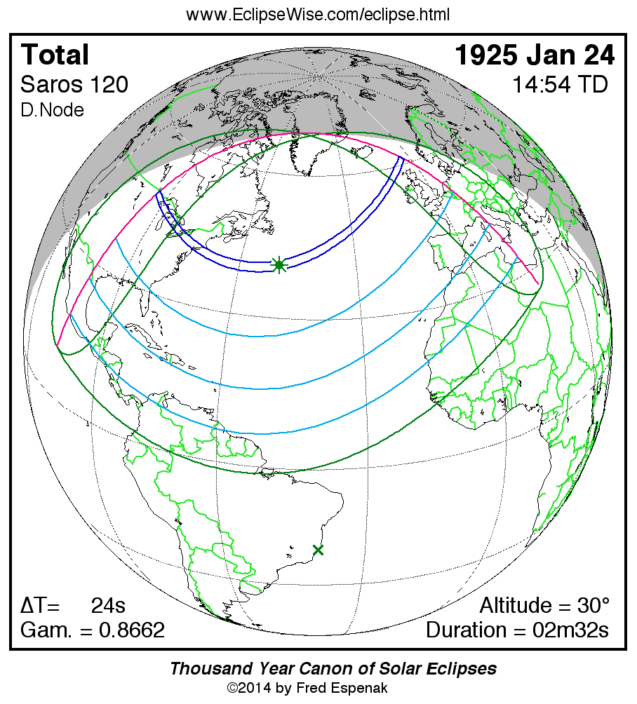 - Orthographic Map: Total Solar Eclipse of 1925 Jan 24 - detailed map of eclipse visibility