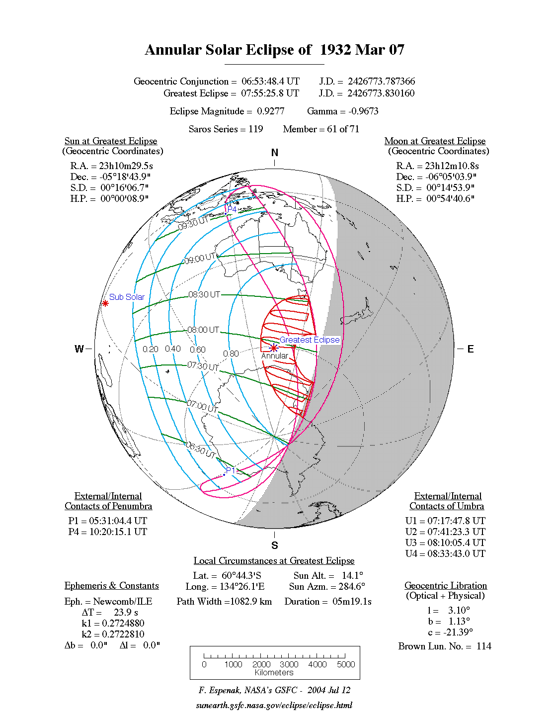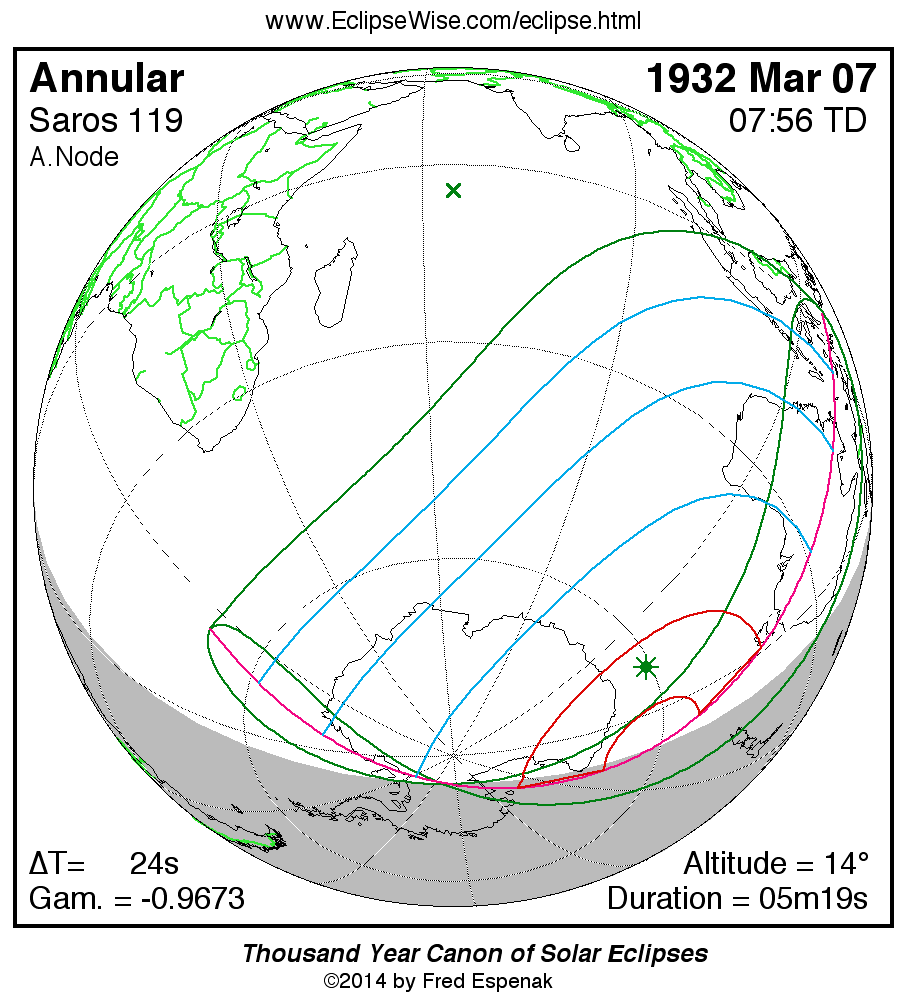 - Path Table: Annular Solar Eclipse of 1932 Mar 07 - coordinates of the central line and path limits