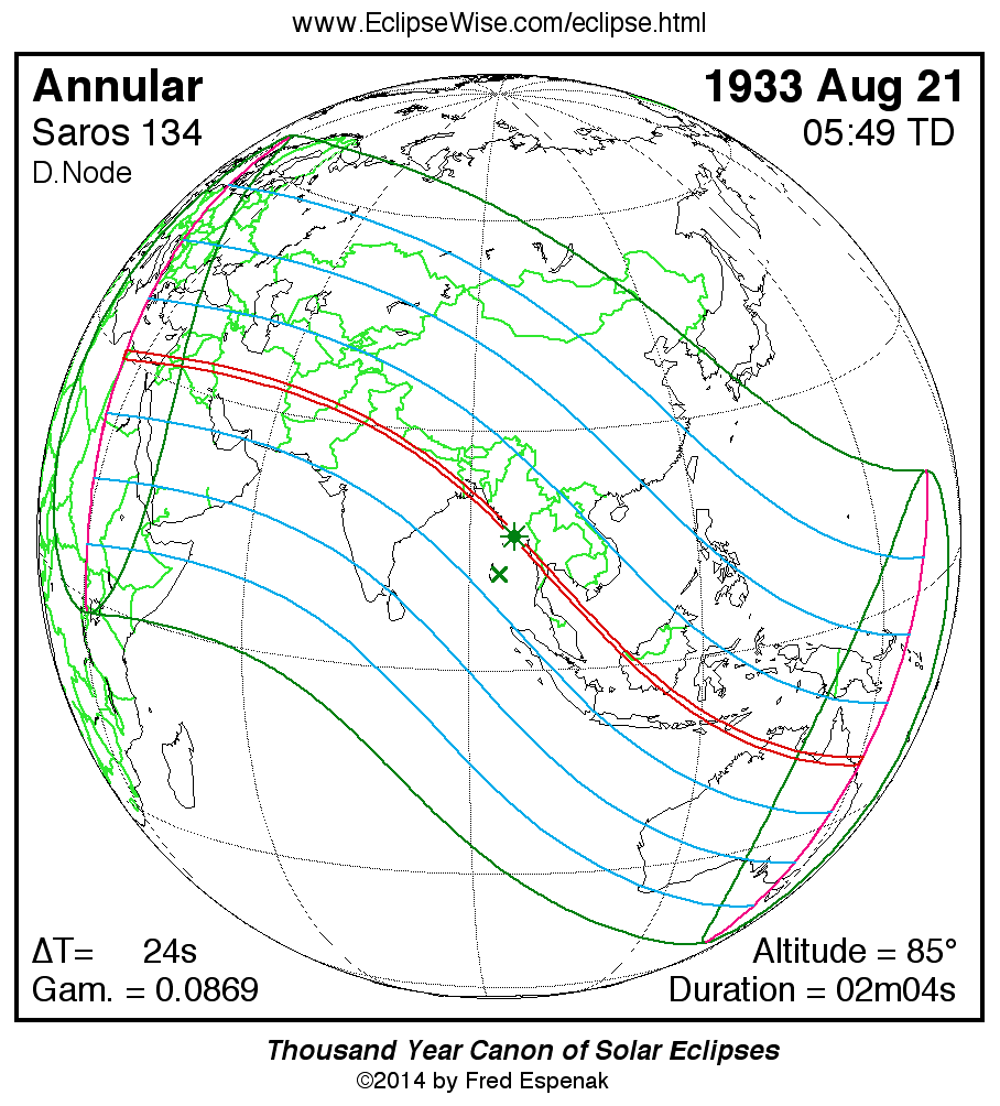- Path Table: Annular Solar Eclipse of 1933 Aug 21 - coordinates of the central line and path limits