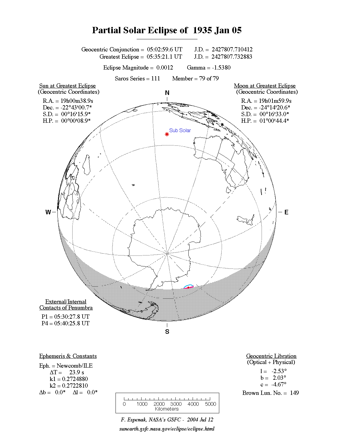 Predictions for the Partial Solar Eclipse of 1935 Jan 05were generated using the JPL DE406solar and lunar ephemerides. The lunar coordinates were calculated with respect to the Moon's Center of Mass. Although the predictions are first calculated in Terrestrial Dynamical Time (TD), they are then converted to Universal Time (UT1) as presented here.The parameter ΔT is used to convert between the two times (i.e., UT1 = TD - ΔT). For this eclipse ΔT has a value of 23.8 seconds.