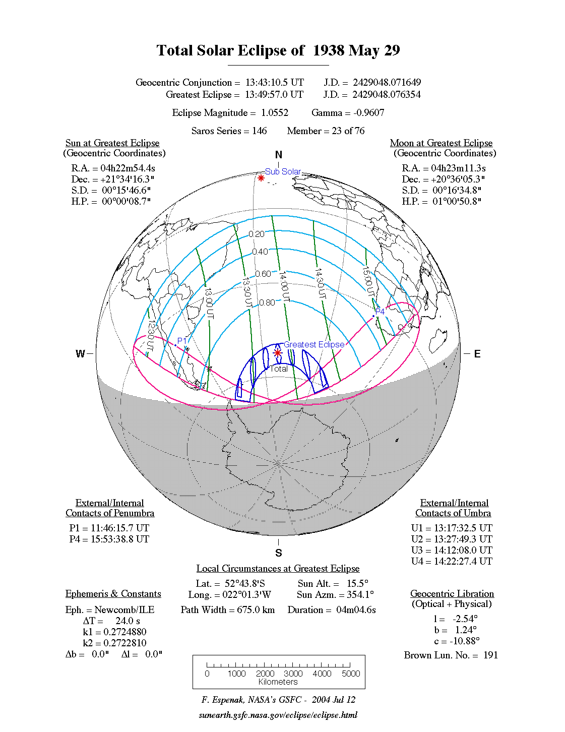 - Path Table: Total Solar Eclipse of 1938 May 29 - coordinates of the central line and path limits