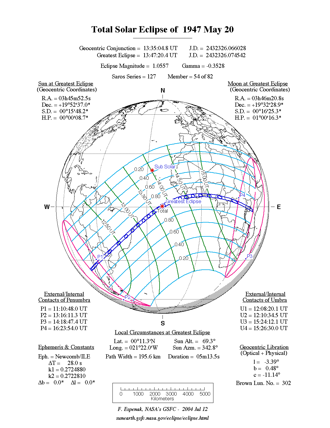 - Path Table: Total Solar Eclipse of 1947 May 20 - coordinates of the central line and path limits